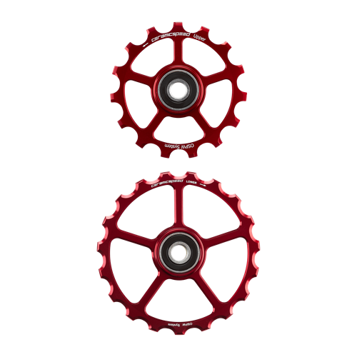 Die CeramicSpeed Schalträdchen für SRAM Red/Force AXS haben 15/19 Zähne mit Narrow-Wide-Design für präzise Kettenbindekraft und verfügen über leicht laufende, belastbare Keramiklager.