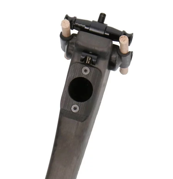 Das Hauptstützrohr besteht aus Kohlefaser unter Verwendung von bidirektionalen und unidirektionalen Stoffen mit asymmetrischem Laminat. Jede Sattelstütze wird von Hand laminiert. Das völlig neue Spannsystem besteht aus zwei ultraleichten Dyneema®-Schlaufen. Es eignet sich für alle Arten von Schienen, einschließlich Carbon-Schienen 7 * 9